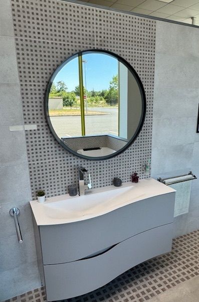 Déstockage ensemble miroir rond diamètre 90cm led avec mitigeur de lavabo chrome, le plan vasque à gauche blanc de 120cm avec le meuble 2 tiroirs 120x45cm gris tourterelle + les accessoires.