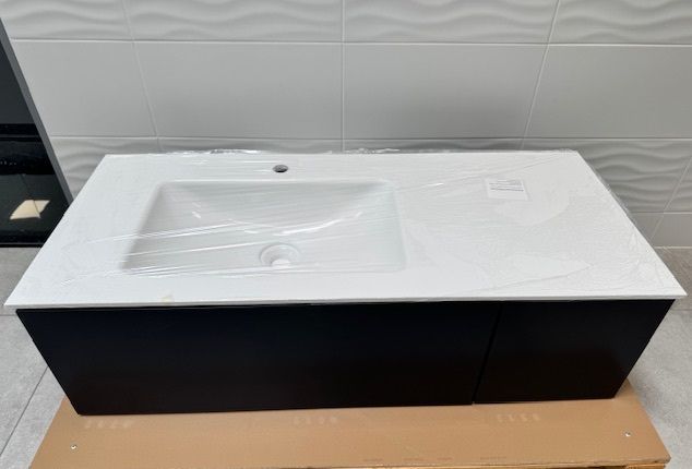 Déstockage d'un ensemble meuble 110x48cm 1 tiroir de 80cm + 1 tiroir de 30cm en noir mat avec le plan vasque décentré à gauche en pierre de synthèse blanc brillant.