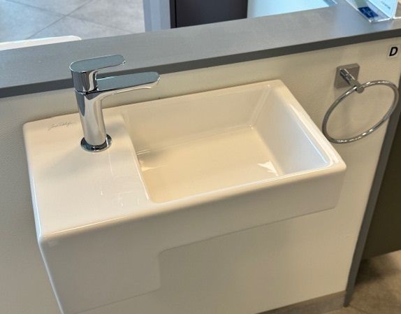 Déstockage d'un lave-mains Jacob céramique blanc long 49x28cm + robinet en eau froide chrome + porte serviette anneaux chrome.